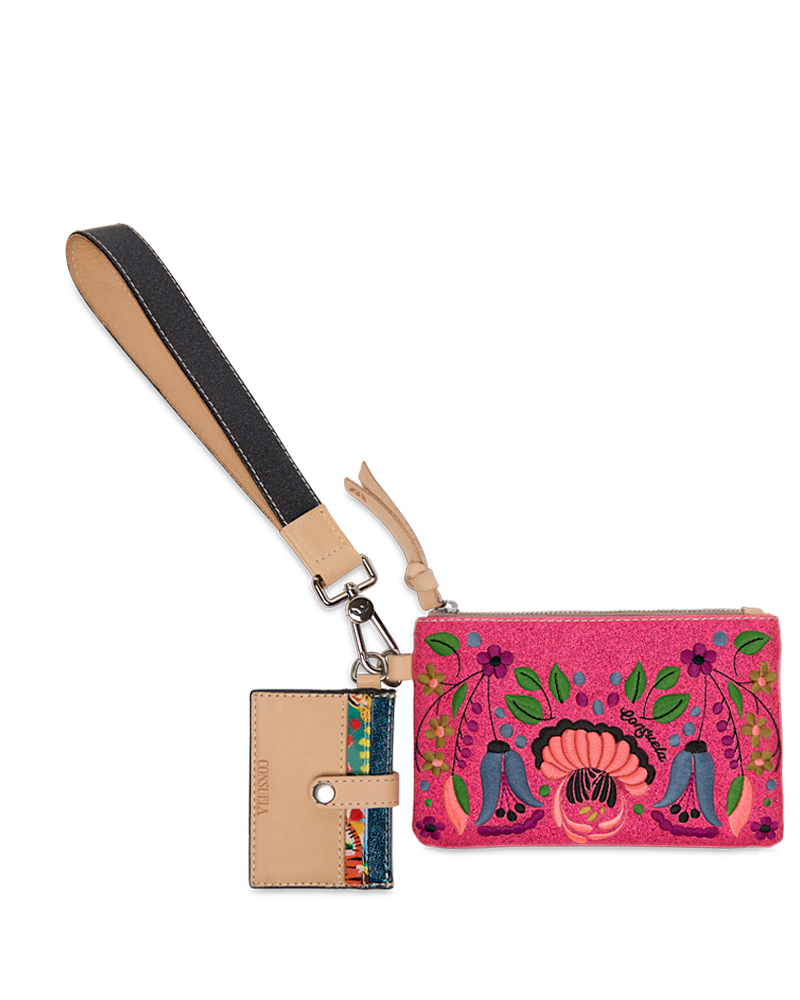 The Combi, a combination of on-the-go accessories, is a new way to carry your keys, cards, and the small stuff together or separately. This embroidered wristlet wallet includes a pocket pouch, secure card slot wallet and fits comfortably around your wrist.