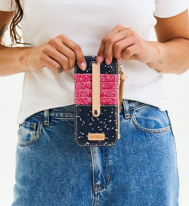 Keeping things light and easy, the card organizer is perfect for credit cards and folded bills. This colorful wallet’s snap-closure and zipper compartment provides security while you take on the day.
