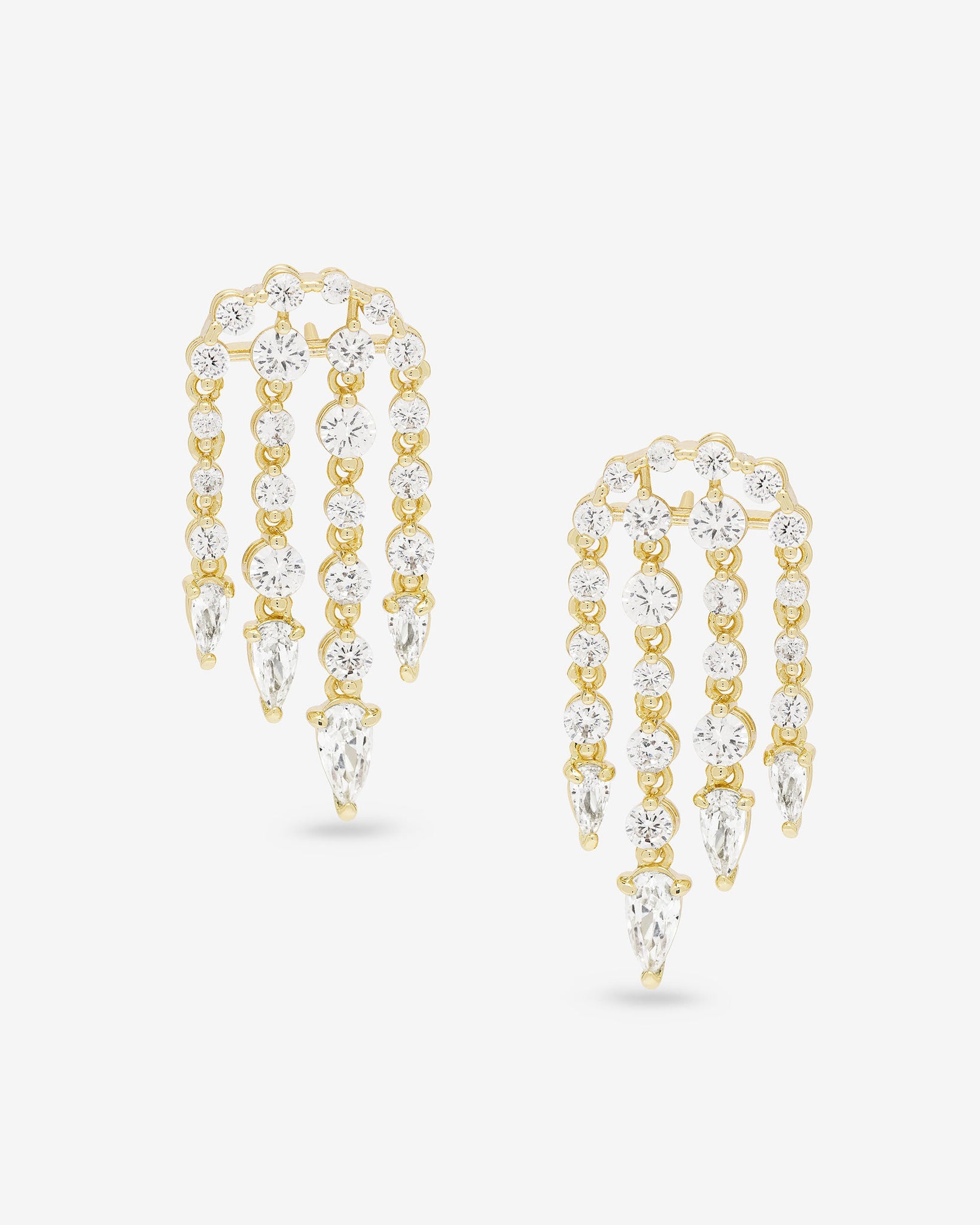 She's arrived and she's fabulous. These chandelier earrings don't just sparkle-they dazzle. With cascading rows of round and pear-cut simulated diamonds, they create the perfect balance between glamour and grace. Made to shimmer, these beauties move with you, catching the light from every angle. Whether it's date night or a red carpet moment, these earrings make sure you steal the spotlight.