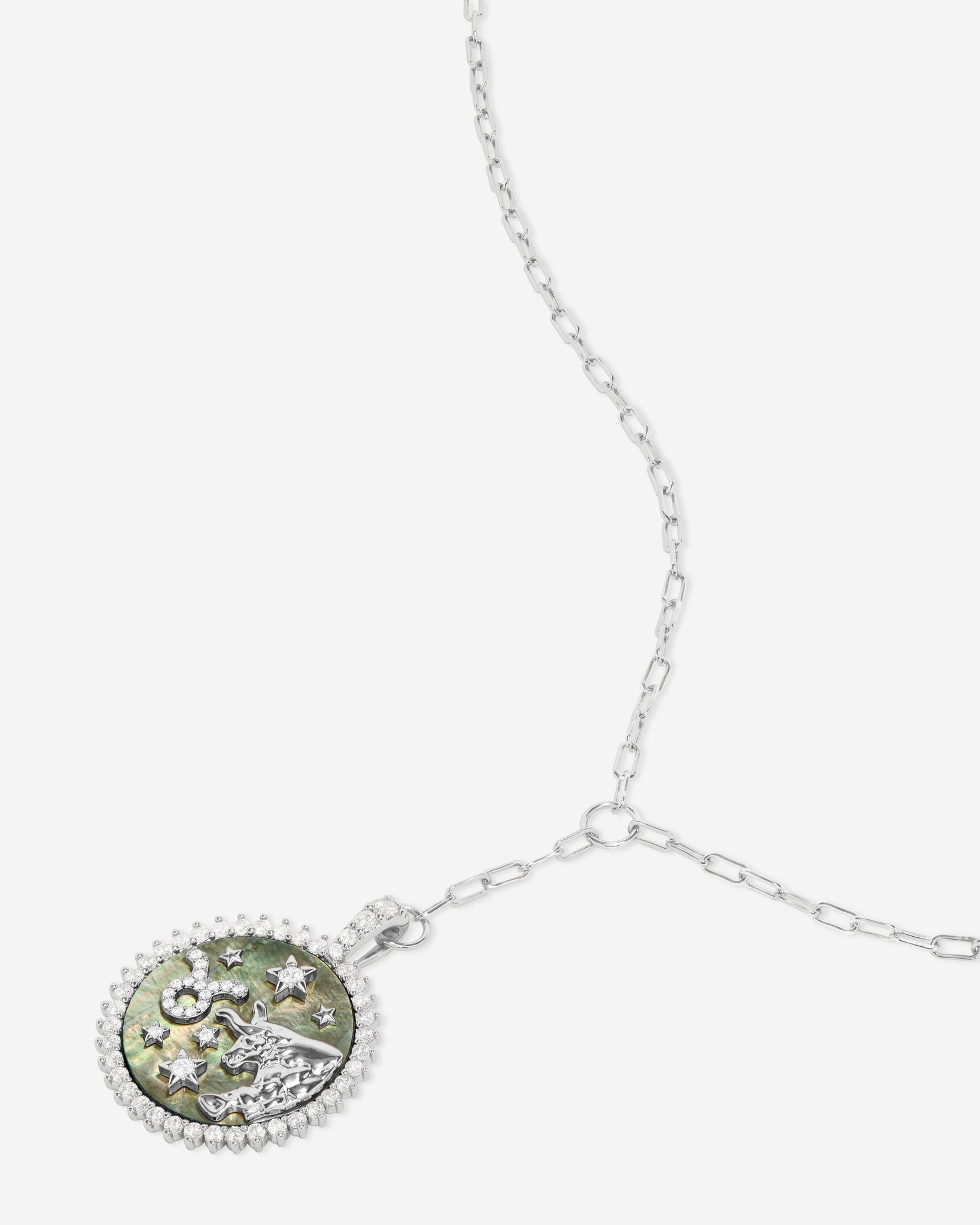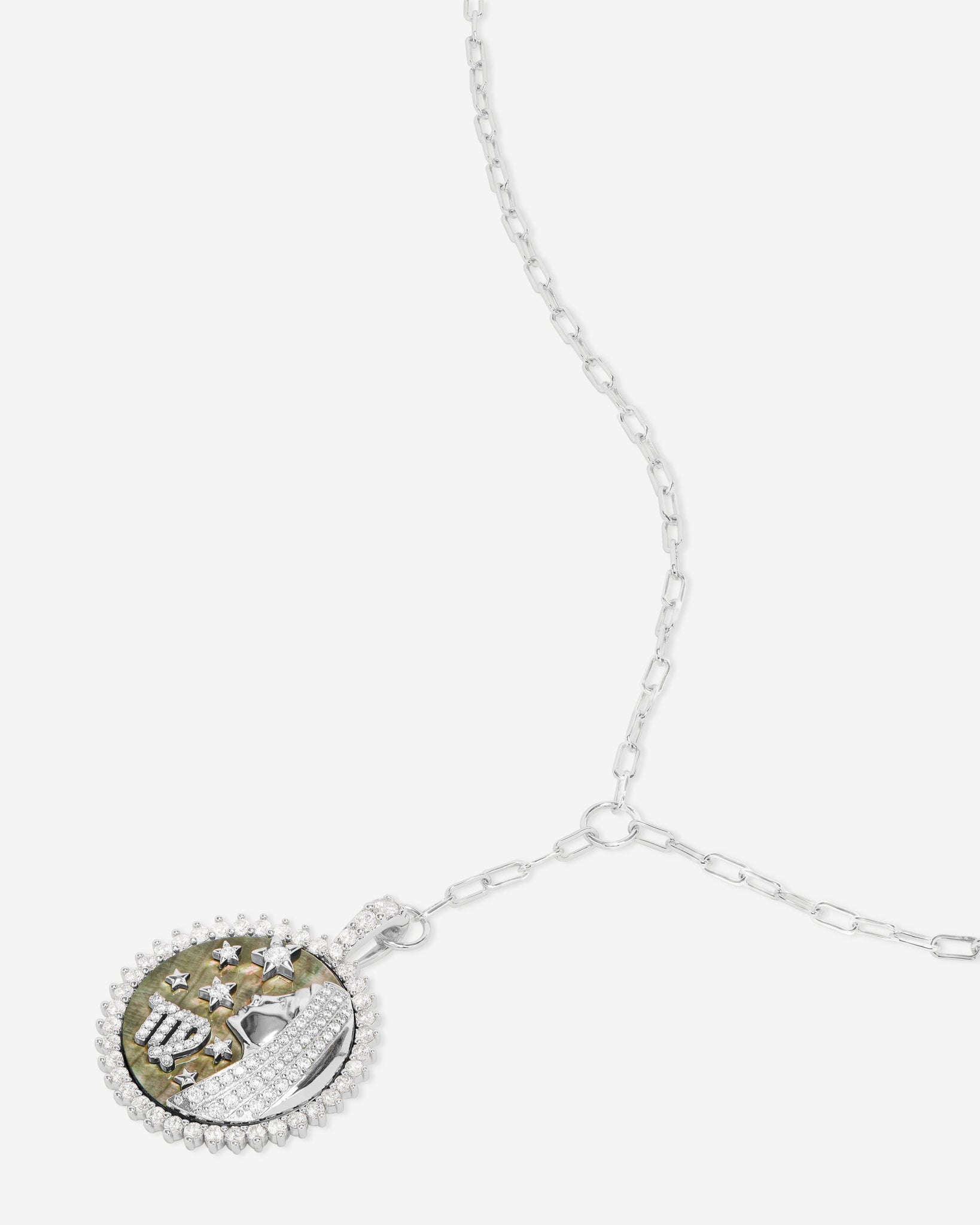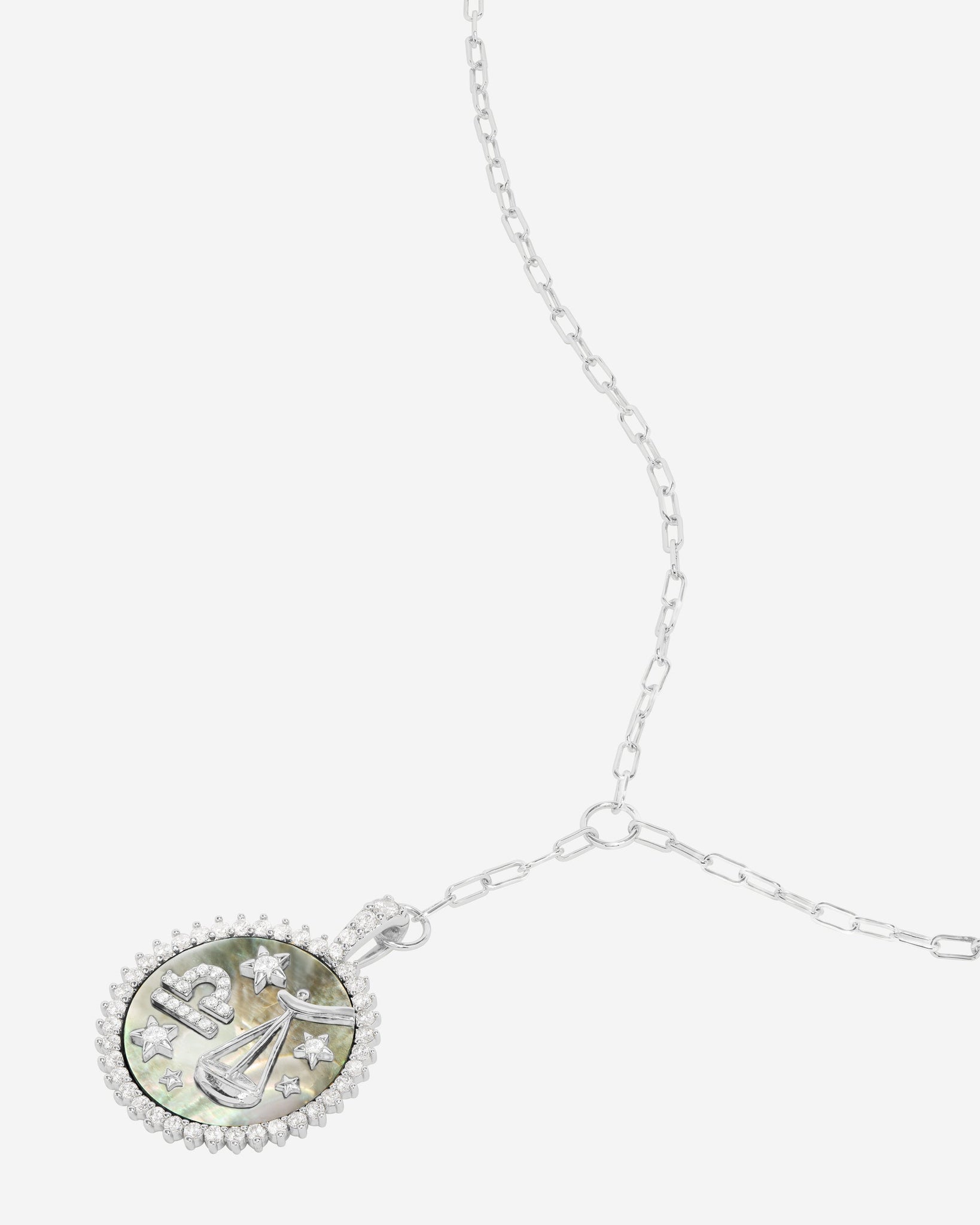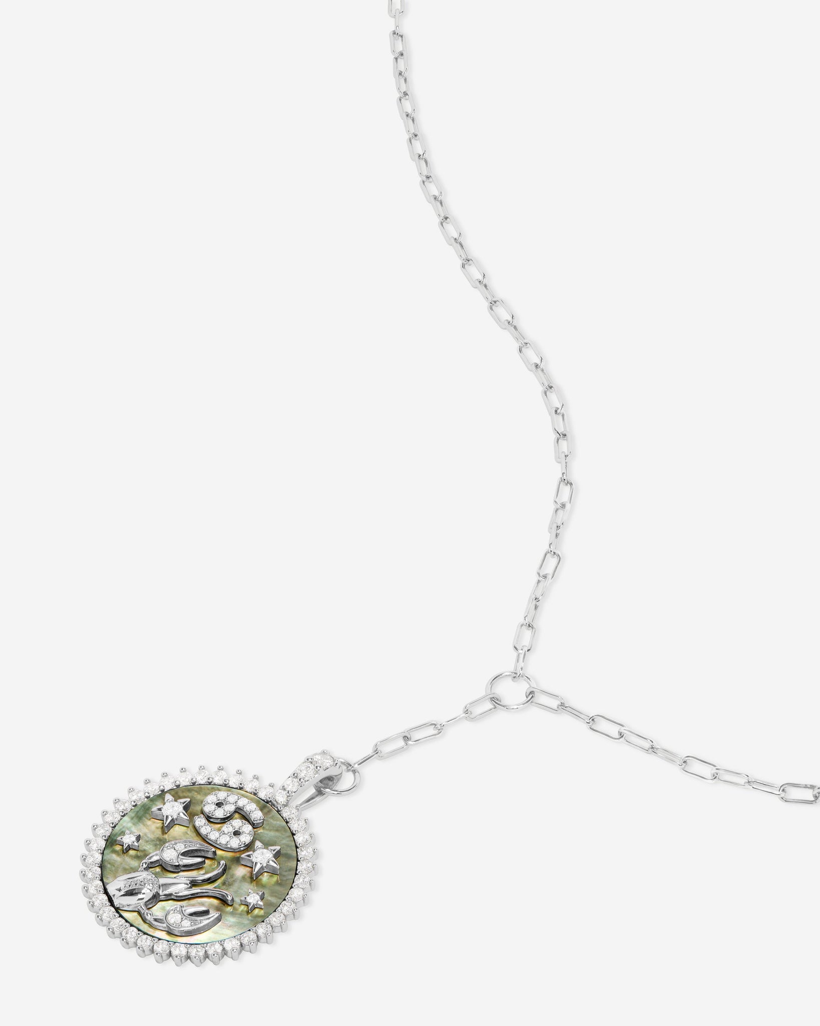 Who says the universe doesn't revolve around you? Our Zodiac Medallion Necklace makes it official. With celestial grey mother-of-pearl, shining simulated diamonds, and a reversible engravable back for whatever cosmic message you're feeling. Astrology never looked so good.