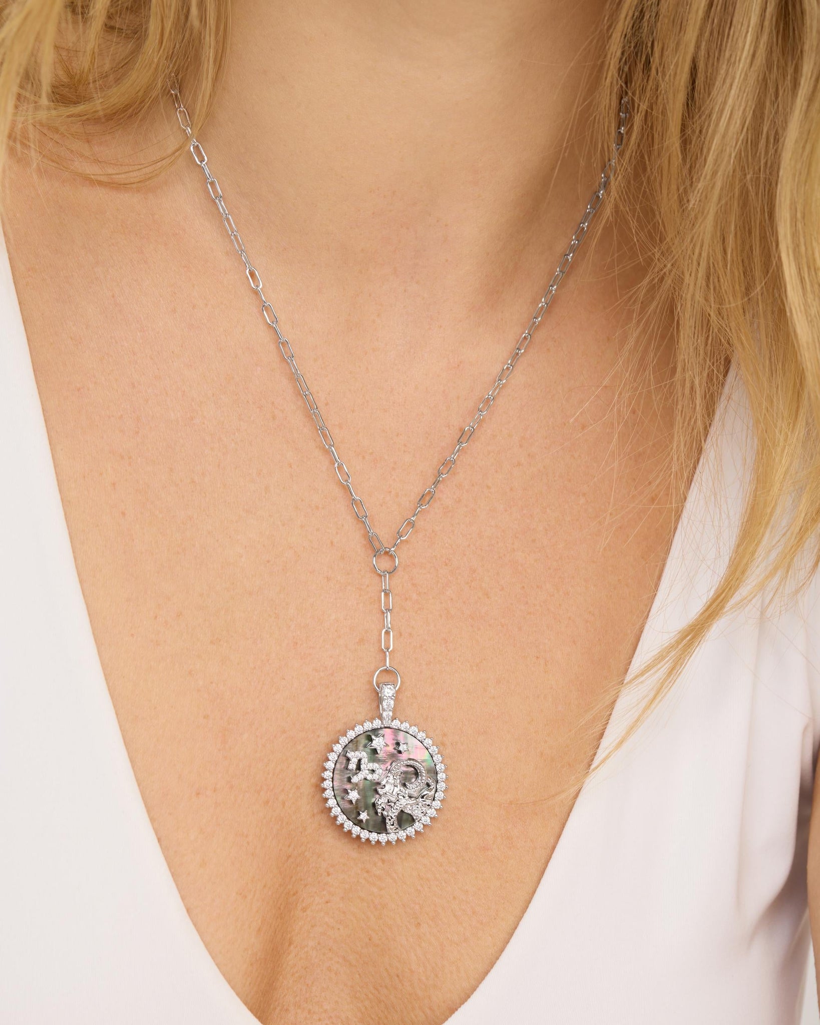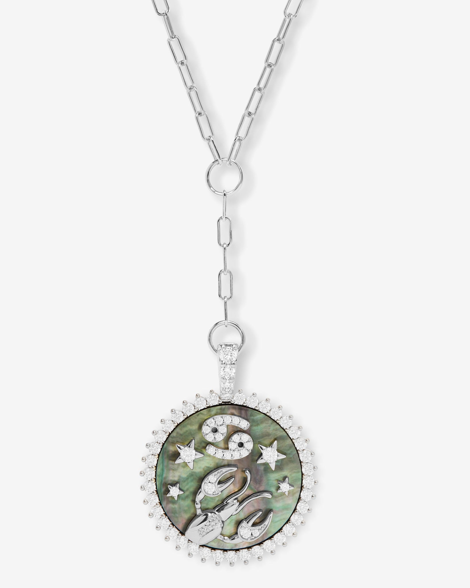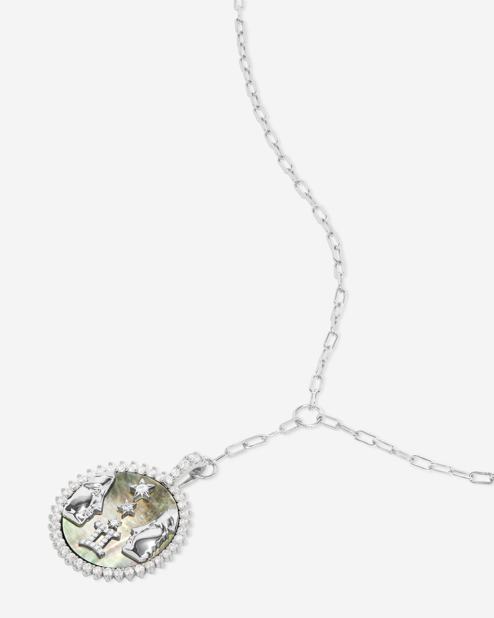Who says the universe doesn't revolve around you? Our Zodiac Medallion Necklace makes it official. With celestial grey mother-of-pearl, shining simulated diamonds, and a reversible engravable back for whatever cosmic message you're feeling. Astrology never looked so good.