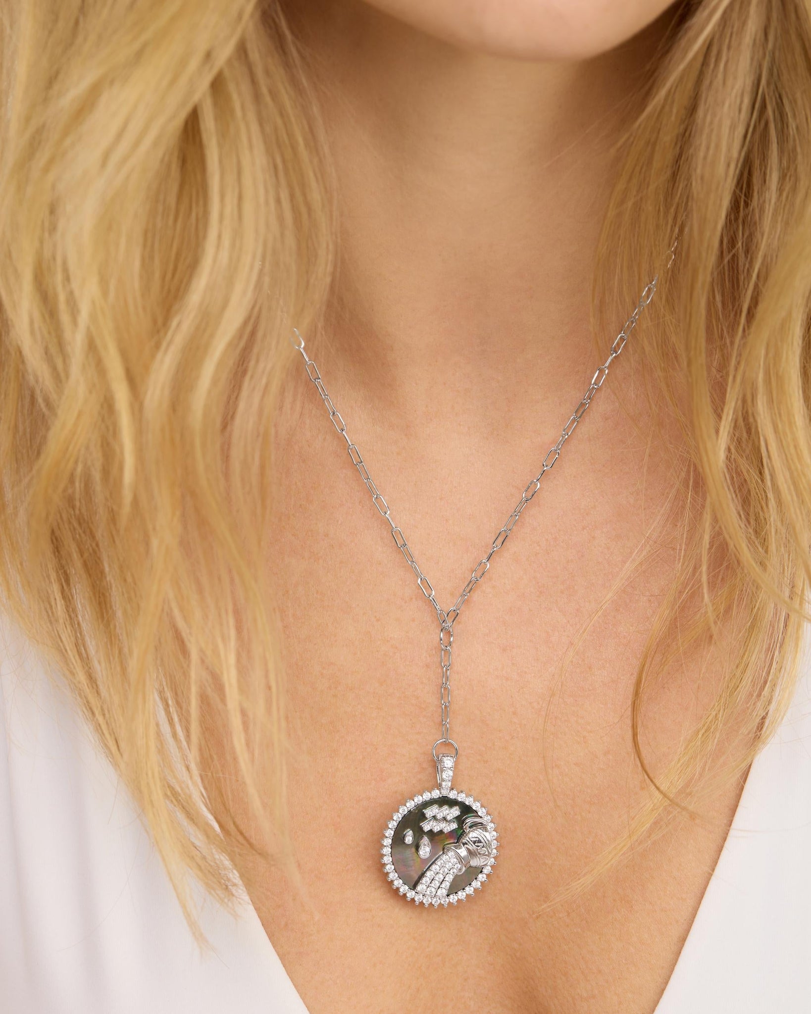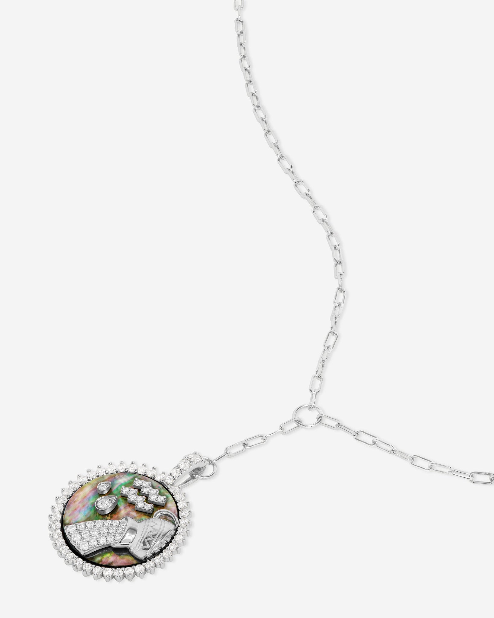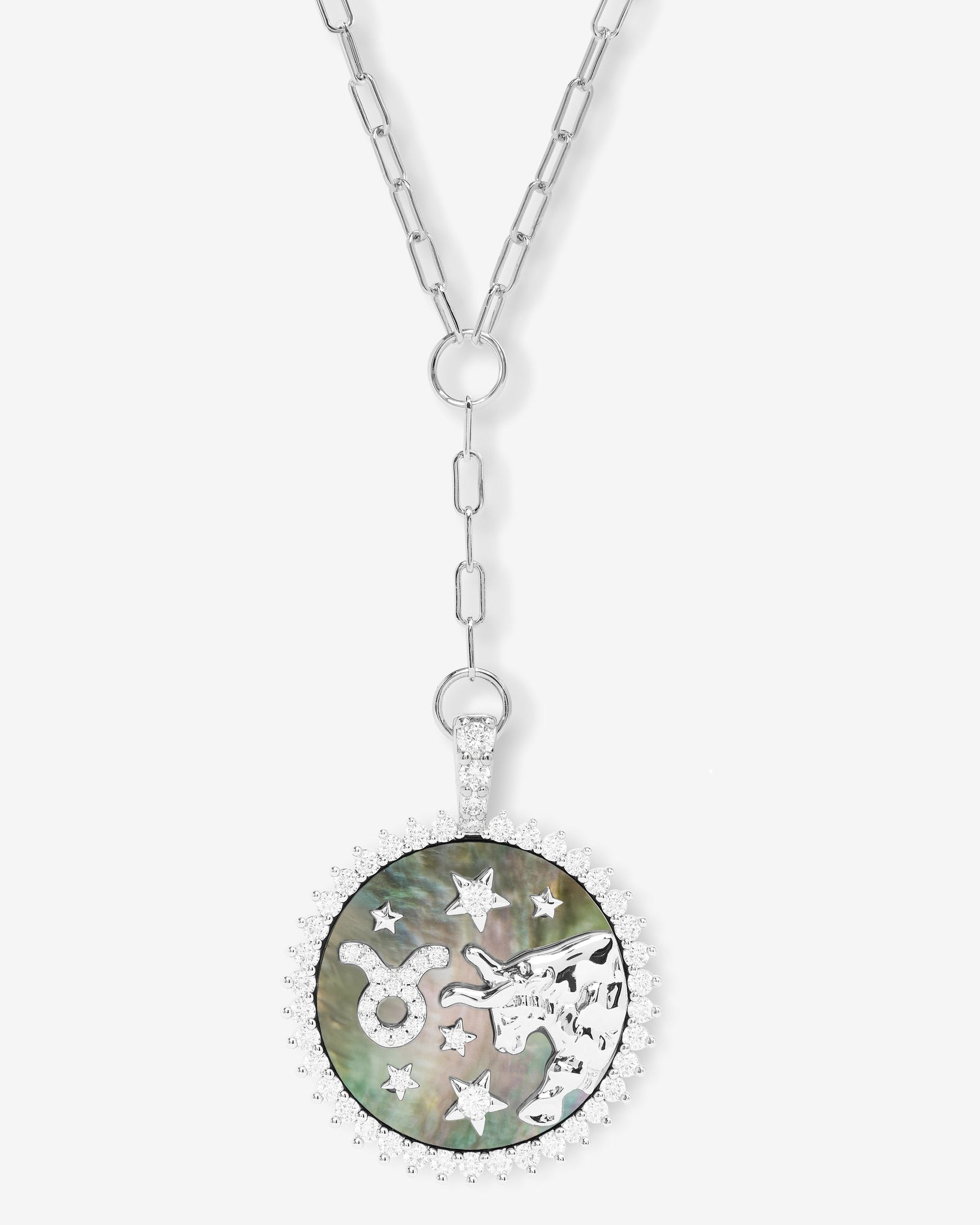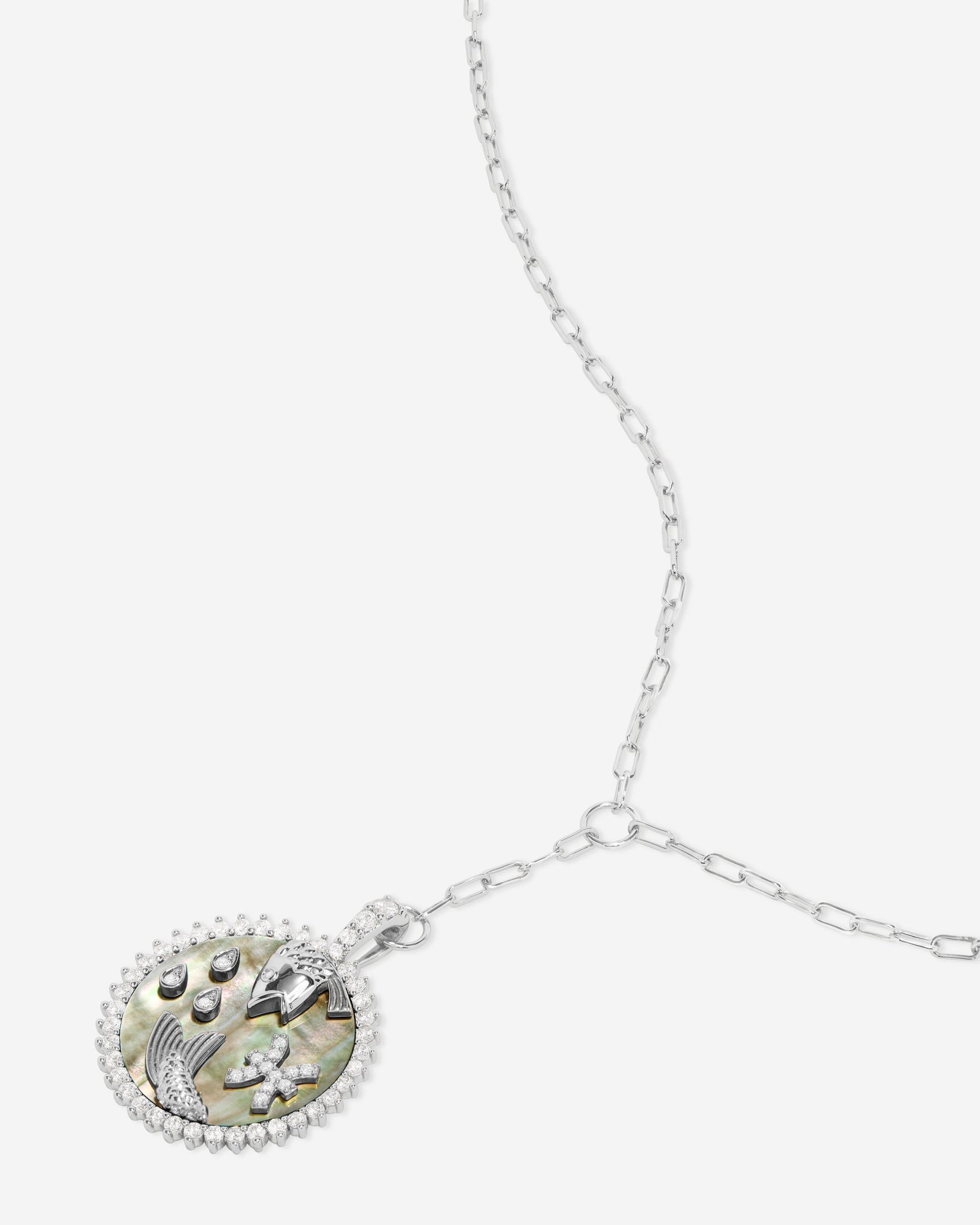 Who says the universe doesn't revolve around you? Our Zodiac Medallion Necklace makes it official. With celestial grey mother-of-pearl, shining simulated diamonds, and a reversible engravable back for whatever cosmic message you're feeling. Astrology never looked so good.